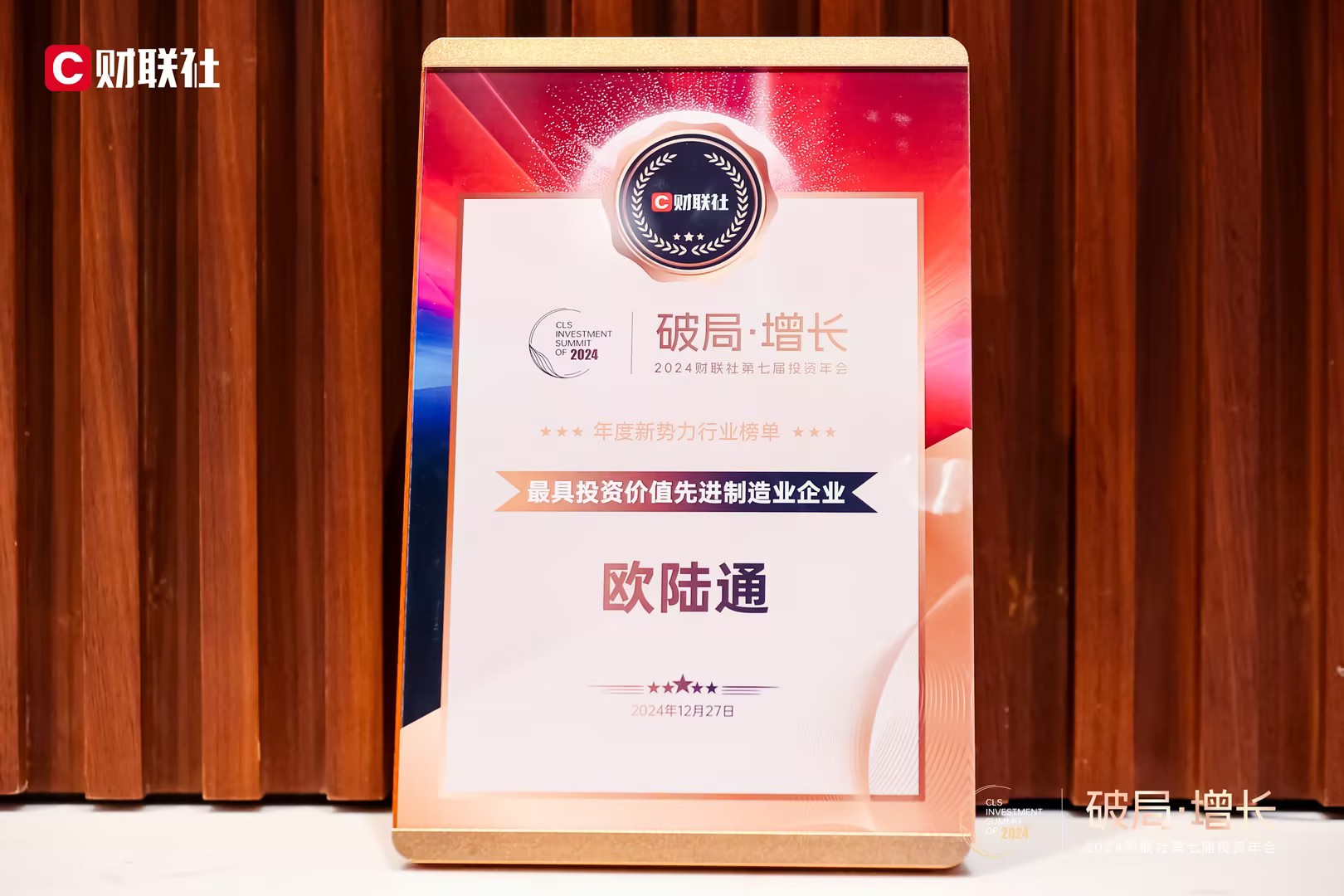12月27日,2024財聯(lián)社第七屆投資年會在上海舉辦,邀請各界嘉賓解讀政策紅利,探討新舊動能轉(zhuǎn)換中的新機會,共同尋找經(jīng)濟發(fā)展新路徑。會上公布了“2024財聯(lián)社資本市場最具價值影響力榜單”,歐陸通獲評“最具投資價值先進制造業(yè)企業(yè)”稱號。